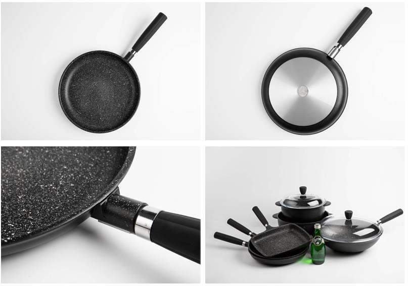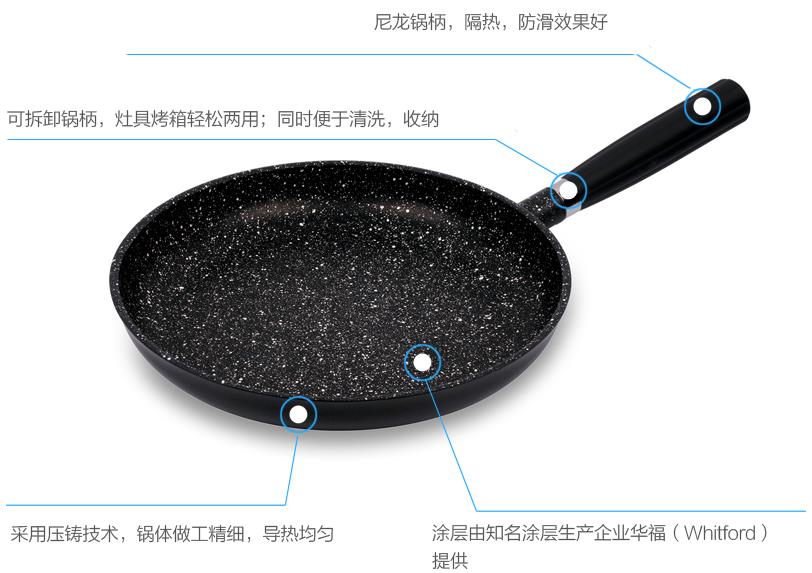 【商品材质】压铸铝材、混合矿石特氟龙不粘涂层、尼龙锅柄