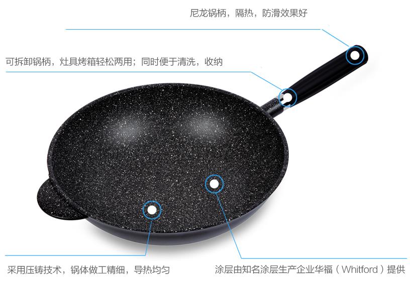 【商品材质】压铸铝材、混合矿石特氟龙不粘涂层、尼龙锅柄