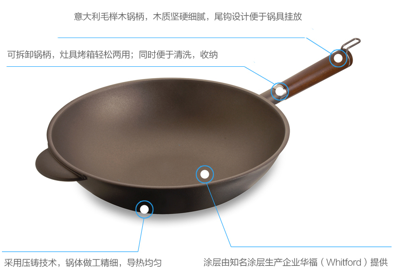 【商品材质】压铸铝材、特氟龙不粘涂层、山毛榉木锅柄