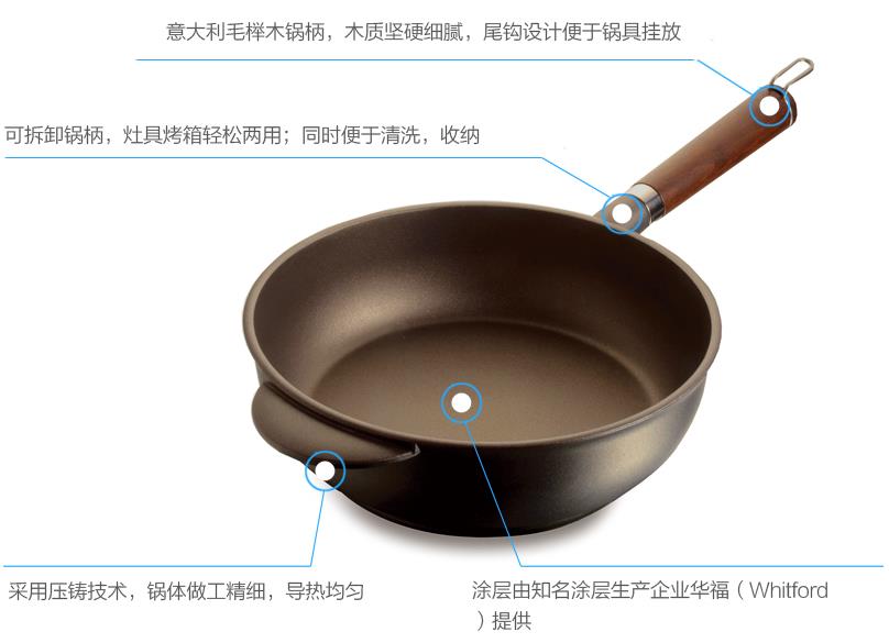 【商品材质】压铸铝材、特氟龙不粘涂层、山毛榉木锅柄